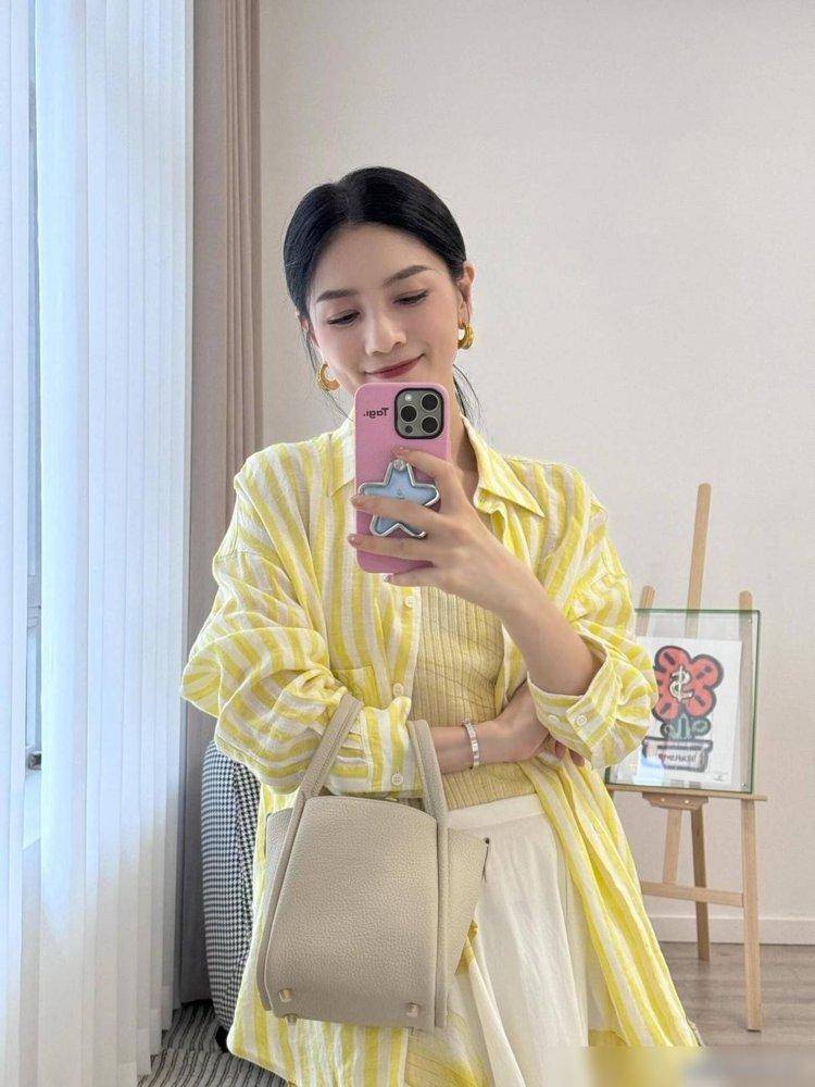 再说那套黄白条纹衫,普通条纹衫要么太素像工作服,要么太花像睡衣,她选的细条纹密度刚好,黄白相间得特别清爽,像把夏天的风揉进衣服里。